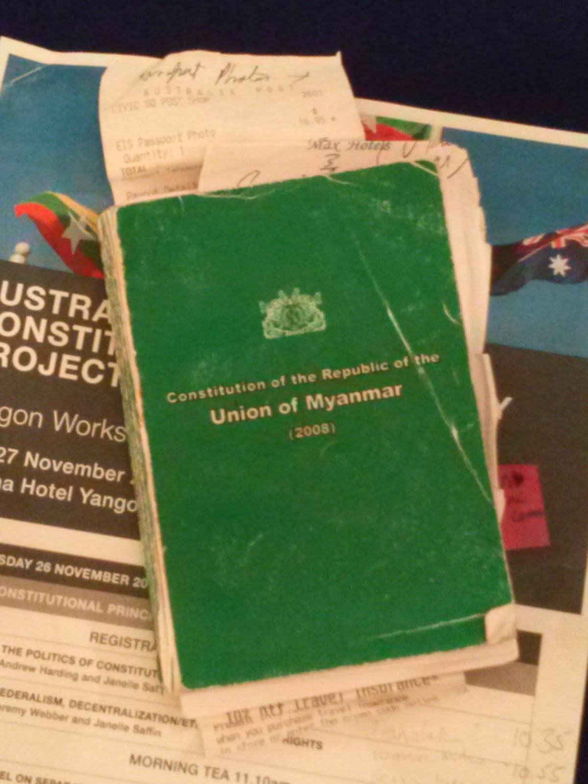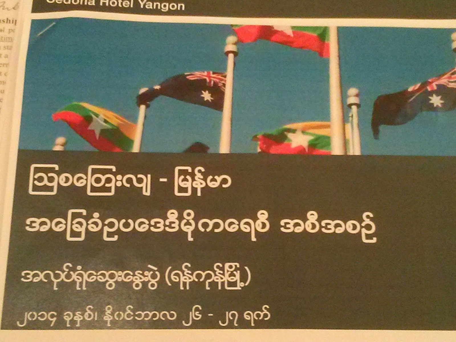 On 26-27 November 2014, the Australia-Myanmar Constitutional Democracy Workshop was held at Sedona Hotel in Yangon. Building on the constitutional law workshop held in 2013, this workshop had a particular focus on constitutional principles and institutions. The workshop was hosted by the University of New South Wales, and also included academics from NUS, ANU, Canada and Germany. The workshop was attended by a range of lawyers, legal professionals and NGOs in Yangon.