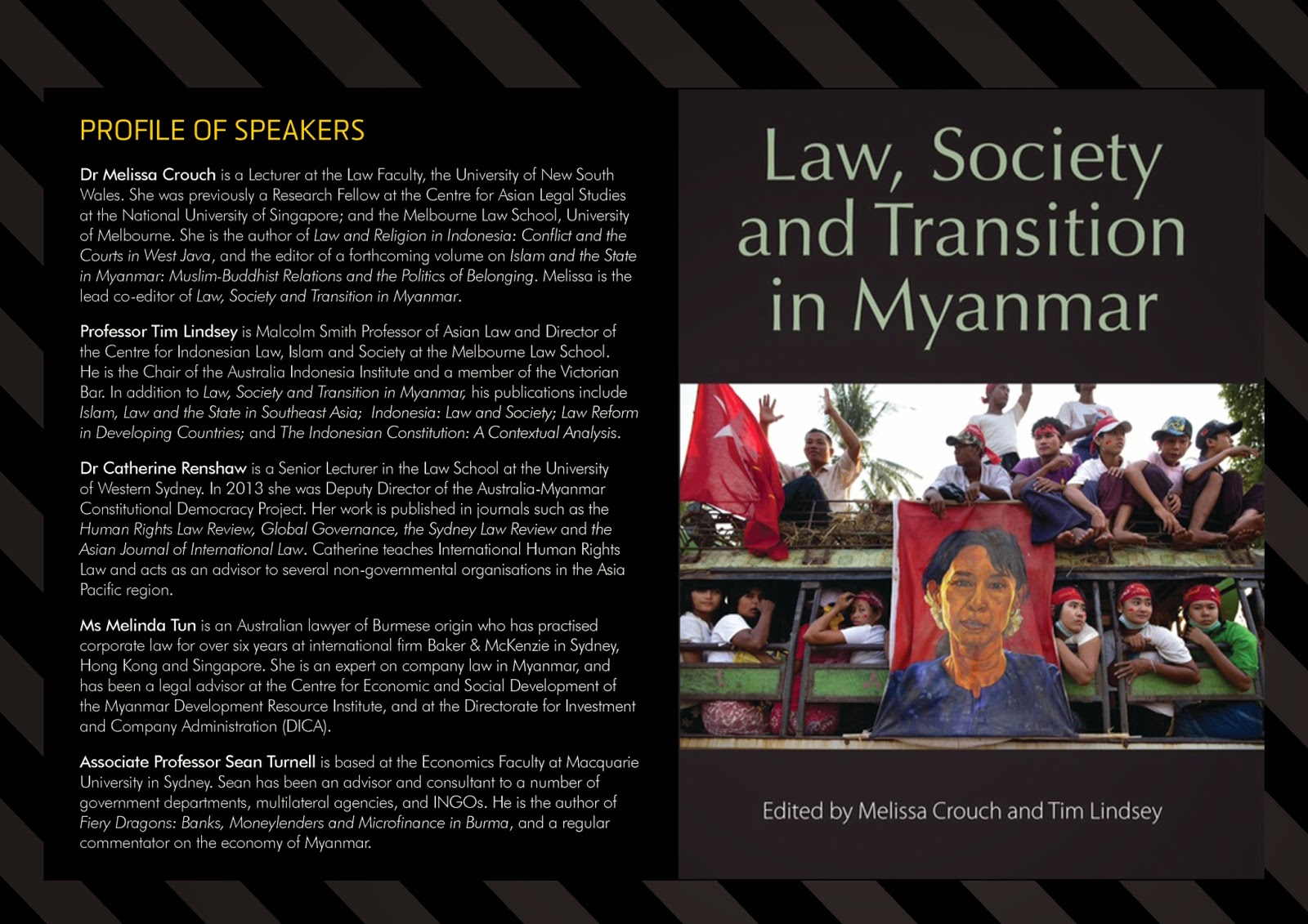 The speakers are all contributors to a recently published book ‘Law, Society and Transition in Myanmar’ (Hart Publishing, 2014), the first book to explore the dynamics of Myanmar’s legal reform process in their social, historical and political context.