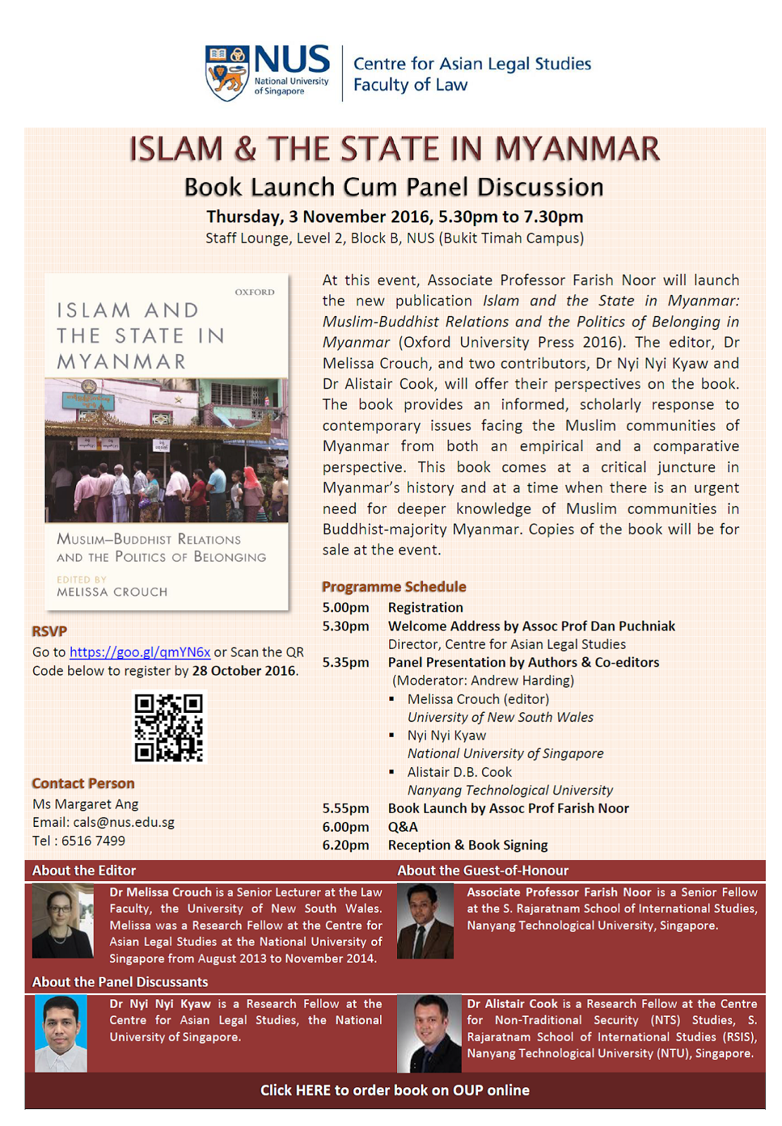 Book launch: 3 Nov 2016 Posted byMelissa CrouchOctober 19, 2016January 19, 2021Posted inBOOK LAUNCH, ISLAM, MYANMAR, RELIGION, STATETags:Post Share this: Click to share on LinkedIn (Opens in new window) LinkedIn Click to share on Facebook (Opens in new window) Facebook Click to email a link to a friend (Opens in new window) Email Click to print (Opens in new window) Print Related
