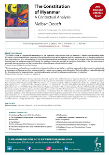 Hart Publishing is pleased to announce that The Constitution of Myanmar is now available for pre-order. This timely and accessible book is the first to provide a thorough analysis of the 2008 Constitution of Myanmar (Burma) in its historical, political and social context. The book offers an in-depth exploration of the key elements of the 2008 Constitution in theory and practice. The book demonstrates how the history of constitution-making in Myanmar informs our understanding of the 2008 Constitution and indicates the credibility gap raised by the past process of constitution-making. The book identifies and articulates the principles of the Constitution through an analysis of legal and political processes since the 1990s. It highlights critical constitutional contestations that have taken place over fundamental ideas such as democracy, federalism, executive-legislative relations, judicial independence and the role of the Tatmadaw (armed forces). This book suggests that the 2008 Constitution facilitates the co-existence of civilian and military authorities in the form of a military-state. Distinct from direct military rule, the military-state promotes the leadership role of the military in governance, based on a set of ideological commitments and organised in the form of a highly centralised Union. The constitutional vision offered by the 2008 Constitution and its associated institutions have been the subject of fierce contestation. Not least is the debate over the militarisation of the state through direct and indirect means. Central to the future of the Constitution and the military-state in Myanmar is the role of the Tatmadaw, and the extent to which the country may shift from a highly centralised Union to a federal or decentralised system of governance.