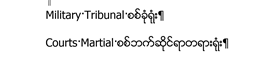 Military tribunals are distinct from the courts martial for military officers. The courts martial have full jurisdiction over Tatmadaw personnel, not civilians. The courts martial are established under the Defence Services Act and Regulations, not a martial law order.